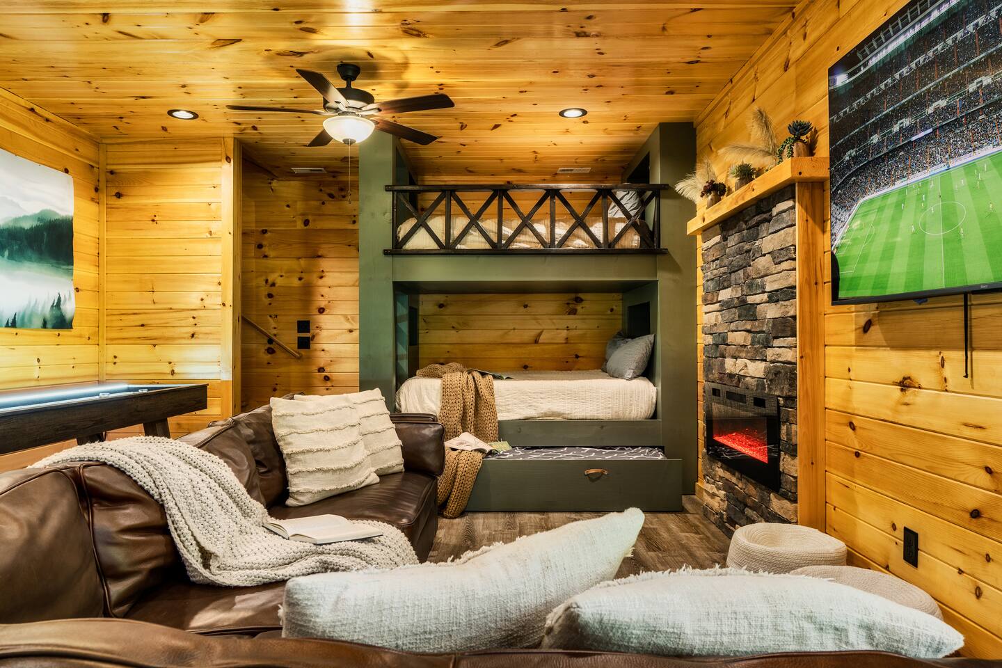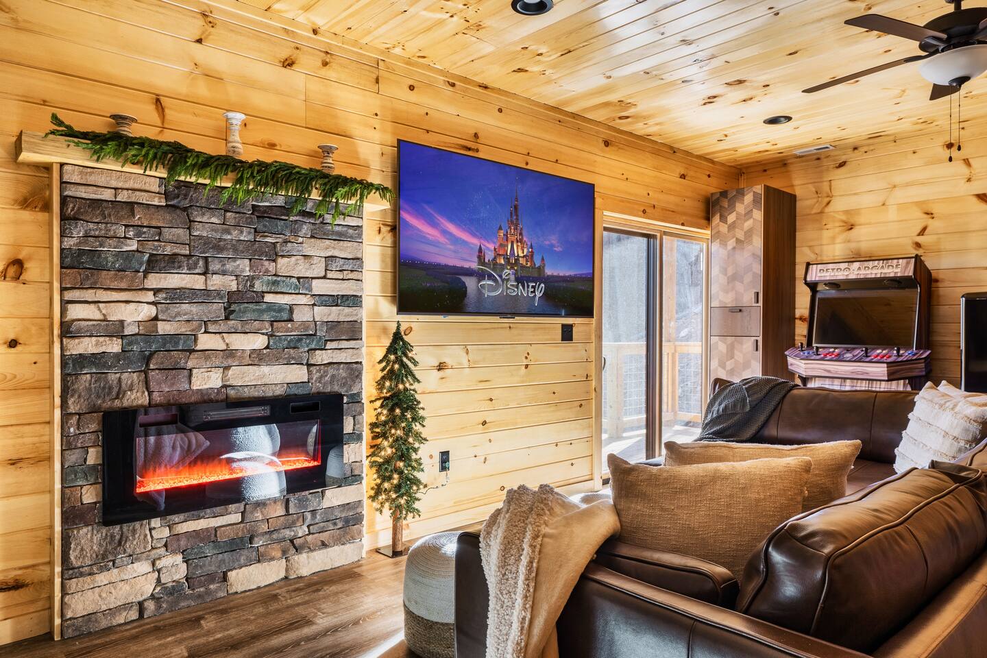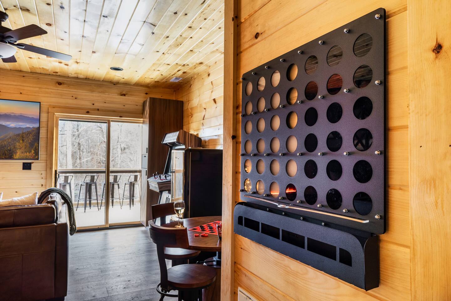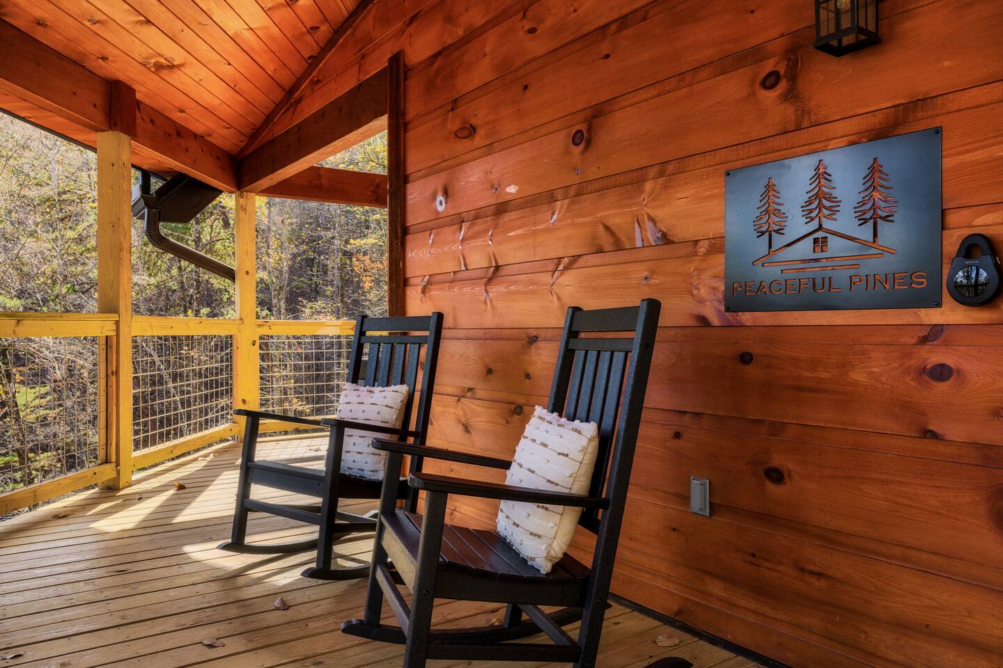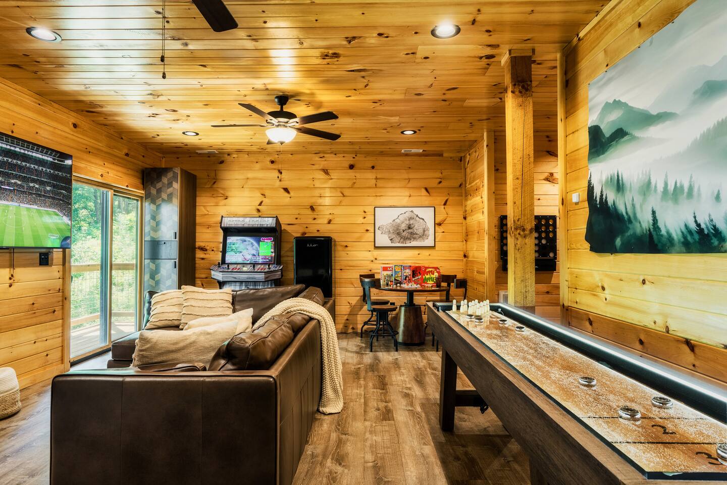 Escape to Peaceful Pines. This serene sanctuary is the ultimate family mountain getaway. A brand new 3 level 3 king en-suit cabin offers a cozy feel with a modern twist. This family-friendly cabin gives an idyllic retreat where laughter and togetherness fill the air, making it the perfect destination to reconnect and create cherished moments with your loved ones. Enjoy the Smoky Mountains with your loved ones in this beautiful relaxing home that includes: * Peaceful seclusion close to major attractions * Private hot tub * Well equipped kitchen with brand new stainless steel appliances * Game room with shuffleboard and 4-person multi-cade with 4,500+ games * 3 indoor fire places * Outdoor fire place * Outdoor dining table * High speed internet * Washer and dryer * Basic cable with Peacock Premium included * 5 smart TVs - bring your own passwords * Two covered decks * Outdoor Grill * Custom full over full bunk bed with twin trundle * Game table for board games and cards Main Floor: * Open concept kitchen and living room with Smart TV and electric fireplace * Large kitchen - well equipped with everything you need including oven with air fryer, Ninja Kitchen System blender, Keurig, and Mr. Coffee drip coffee pot * Dining table for 8 along with bar seating for 4. * King bedroom with en-suite bathroom, smart TV and fire place * Access to main level deck with outdoor seating * Main level deck has a fire place and plenty of seating areas * Outdoor dining with festive lighting * Private 5 person hot tub * Custom bar top with seating for 4 Lower Level: * King bedroom with en-suite bathroom and smart TV * Game room - - Four-person multi-cade with 4,500+ games: Golden Tee, Super Mario Brothers, Galaga, Ms. Pacman, Frogger, Street Fighter, and many more - Shuffleboard table - 75" smart TV - Game table with seating for 4 for those family Euchre games or never ending Monopoly games - Retro style mini fridge * Full size Washer and Dryer * Access to lower deck with custom 4 person bar top with outdoor seating including a sectional Upper Level: * Cozy loft for reading your favorite book, enjoying a cup of coffee, or a quiet space to send a few emails * King bedroom with ensuite bathroom and smart tv * Stylish Sleeper sofa * Custom metal scrabble board Conveniently located to major area attractions *Located in the Great Smoky Arts & Crafts Community - the largest independent organization of artisans in the United States (1.8 Miles) *Downtown Gatlinburg - (4.2 Miles) *Great Smokey Mountain National Park - (5.1 Miles) *The Island in Pigeon Forge - (11.3 Miles) * Dollywood - (11.9 Miles) * Cades Cove - (36.3 Miles)
