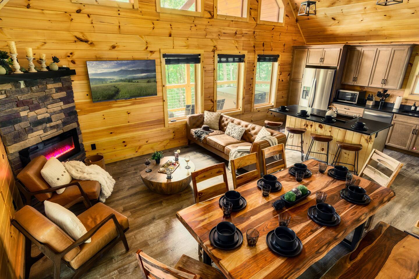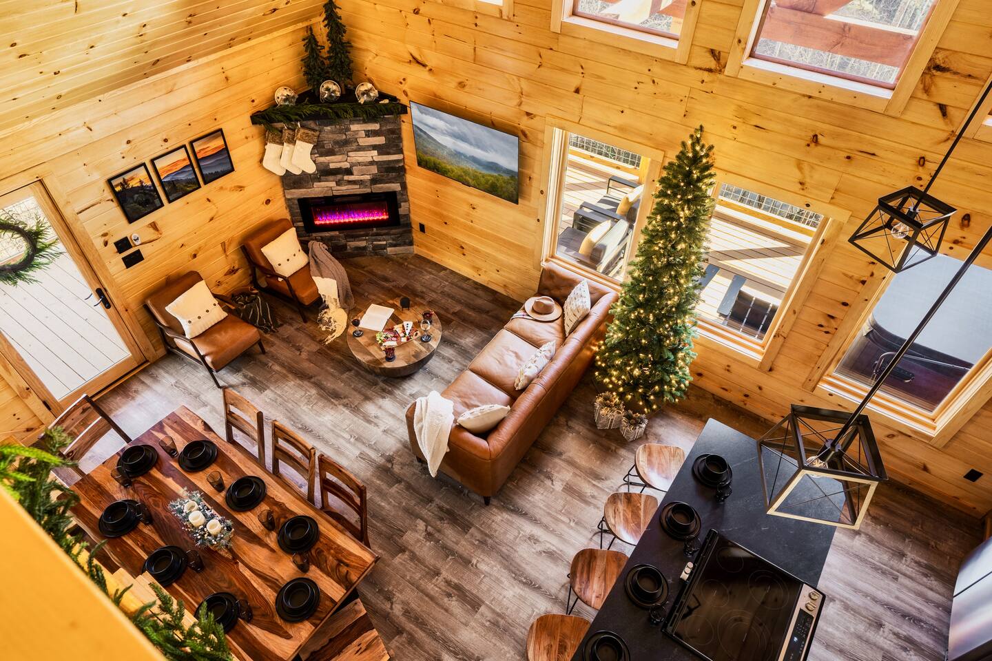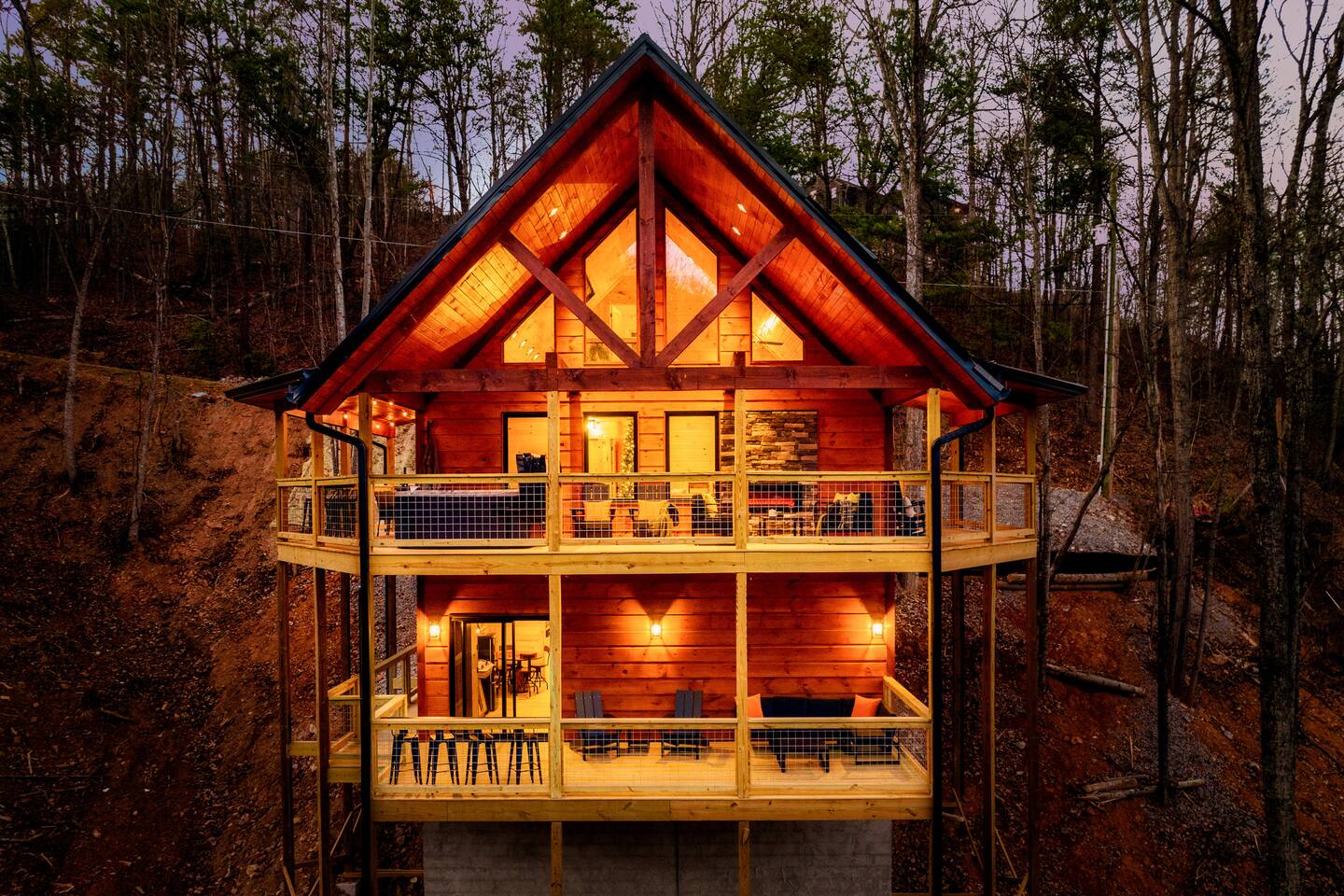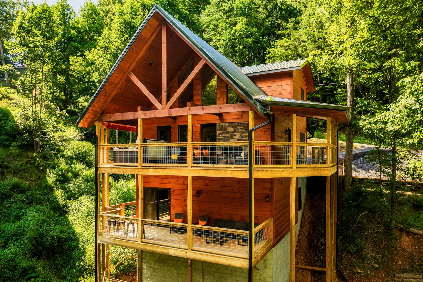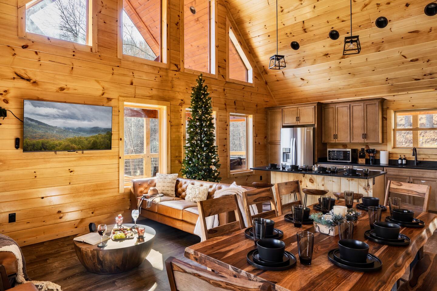 Escape to Peaceful Pines. This serene sanctuary is the ultimate family mountain getaway. A brand new 3 level 3 king en-suit cabin offers a cozy feel with a modern twist. This family-friendly cabin gives an idyllic retreat where laughter and togetherness fill the air, making it the perfect destination to reconnect and create cherished moments with your loved ones. Enjoy the Smoky Mountains with your loved ones in this beautiful relaxing home that includes: * Peaceful seclusion close to major attractions * Private hot tub * Well equipped kitchen with brand new stainless steel appliances * Game room with shuffleboard and 4-person multi-cade with 4,500+ games * 3 indoor fire places * Outdoor fire place * Outdoor dining table * High speed internet * Washer and dryer * Basic cable with Peacock Premium included * 5 smart TVs - bring your own passwords * Two covered decks * Outdoor Grill * Custom full over full bunk bed with twin trundle * Game table for board games and cards Main Floor: * Open concept kitchen and living room with Smart TV and electric fireplace * Large kitchen - well equipped with everything you need including oven with air fryer, Ninja Kitchen System blender, Keurig, and Mr. Coffee drip coffee pot * Dining table for 8 along with bar seating for 4. * King bedroom with en-suite bathroom, smart TV and fire place * Access to main level deck with outdoor seating * Main level deck has a fire place and plenty of seating areas * Outdoor dining with festive lighting * Private 5 person hot tub * Custom bar top with seating for 4 Lower Level: * King bedroom with en-suite bathroom and smart TV * Game room - - Four-person multi-cade with 4,500+ games: Golden Tee, Super Mario Brothers, Galaga, Ms. Pacman, Frogger, Street Fighter, and many more - Shuffleboard table - 75" smart TV - Game table with seating for 4 for those family Euchre games or never ending Monopoly games - Retro style mini fridge * Full size Washer and Dryer * Access to lower deck with custom 4 person bar top with outdoor seating including a sectional Upper Level: * Cozy loft for reading your favorite book, enjoying a cup of coffee, or a quiet space to send a few emails * King bedroom with ensuite bathroom and smart tv * Stylish Sleeper sofa * Custom metal scrabble board Conveniently located to major area attractions *Located in the Great Smoky Arts & Crafts Community - the largest independent organization of artisans in the United States (1.8 Miles) *Downtown Gatlinburg - (4.2 Miles) *Great Smokey Mountain National Park - (5.1 Miles) *The Island in Pigeon Forge - (11.3 Miles) * Dollywood - (11.9 Miles) * Cades Cove - (36.3 Miles)