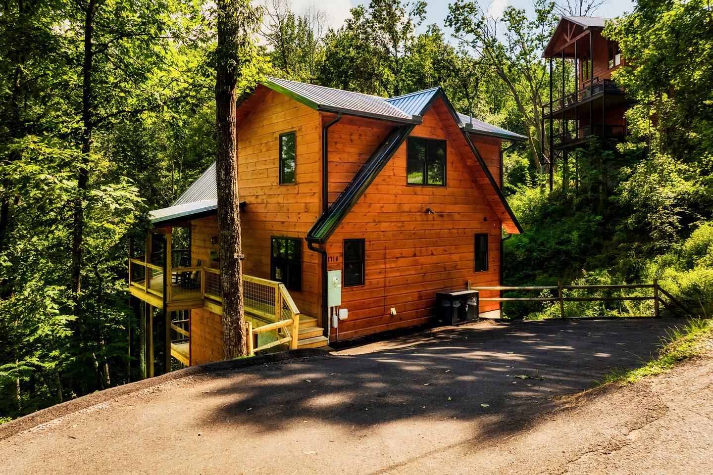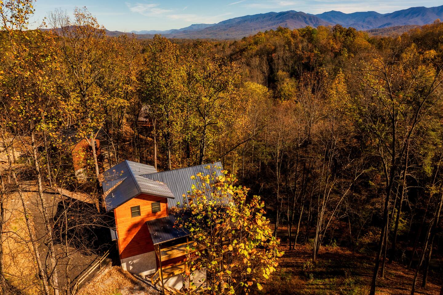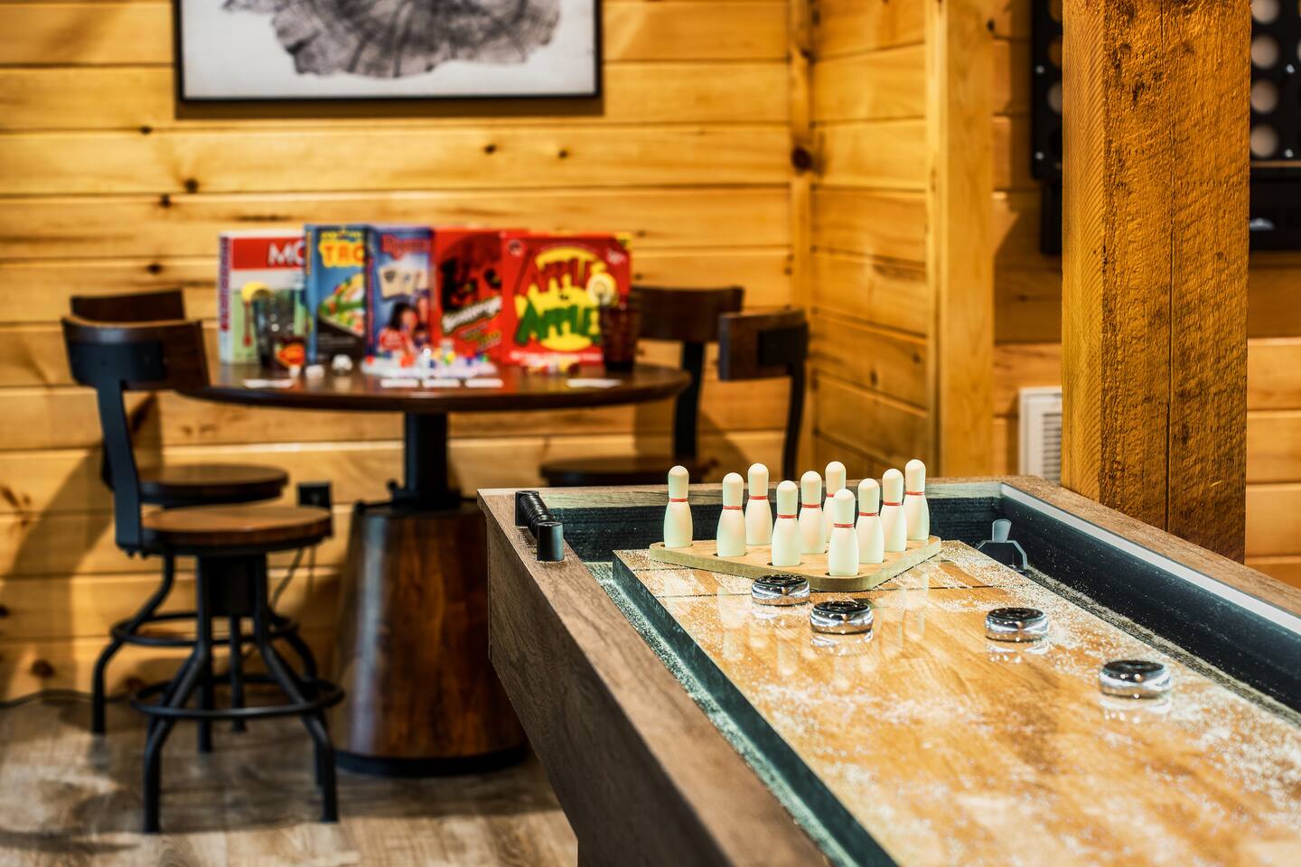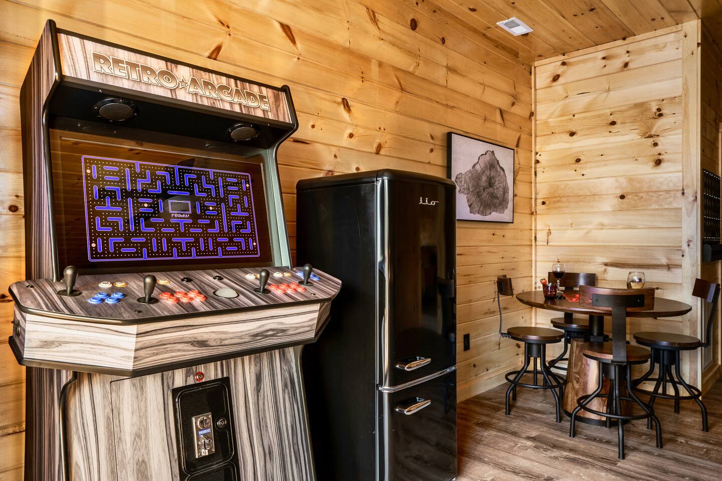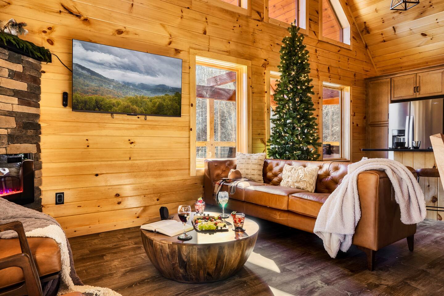 Escape to Peaceful Pines. This serene sanctuary is the ultimate family mountain getaway. A brand new 3 level 3 king en-suit cabin offers a cozy feel with a modern twist. This family-friendly cabin gives an idyllic retreat where laughter and togetherness fill the air, making it the perfect destination to reconnect and create cherished moments with your loved ones. Enjoy the Smoky Mountains with your loved ones in this beautiful relaxing home that includes: * Peaceful seclusion close to major attractions * Private hot tub * Well equipped kitchen with brand new stainless steel appliances * Game room with shuffleboard and 4-person multi-cade with 4,500+ games * 3 indoor fire places * Outdoor fire place * Outdoor dining table * High speed internet * Washer and dryer * Basic cable with Peacock Premium included * 5 smart TVs - bring your own passwords * Two covered decks * Outdoor Grill * Custom full over full bunk bed with twin trundle * Game table for board games and cards Main Floor: * Open concept kitchen and living room with Smart TV and electric fireplace * Large kitchen - well equipped with everything you need including oven with air fryer, Ninja Kitchen System blender, Keurig, and Mr. Coffee drip coffee pot * Dining table for 8 along with bar seating for 4. * King bedroom with en-suite bathroom, smart TV and fire place * Access to main level deck with outdoor seating * Main level deck has a fire place and plenty of seating areas * Outdoor dining with festive lighting * Private 5 person hot tub * Custom bar top with seating for 4 Lower Level: * King bedroom with en-suite bathroom and smart TV * Game room - - Four-person multi-cade with 4,500+ games: Golden Tee, Super Mario Brothers, Galaga, Ms. Pacman, Frogger, Street Fighter, and many more - Shuffleboard table - 75" smart TV - Game table with seating for 4 for those family Euchre games or never ending Monopoly games - Retro style mini fridge * Full size Washer and Dryer * Access to lower deck with custom 4 person bar top with outdoor seating including a sectional Upper Level: * Cozy loft for reading your favorite book, enjoying a cup of coffee, or a quiet space to send a few emails * King bedroom with ensuite bathroom and smart tv * Stylish Sleeper sofa * Custom metal scrabble board Conveniently located to major area attractions *Located in the Great Smoky Arts & Crafts Community - the largest independent organization of artisans in the United States (1.8 Miles) *Downtown Gatlinburg - (4.2 Miles) *Great Smokey Mountain National Park - (5.1 Miles) *The Island in Pigeon Forge - (11.3 Miles) * Dollywood - (11.9 Miles) * Cades Cove - (36.3 Miles)